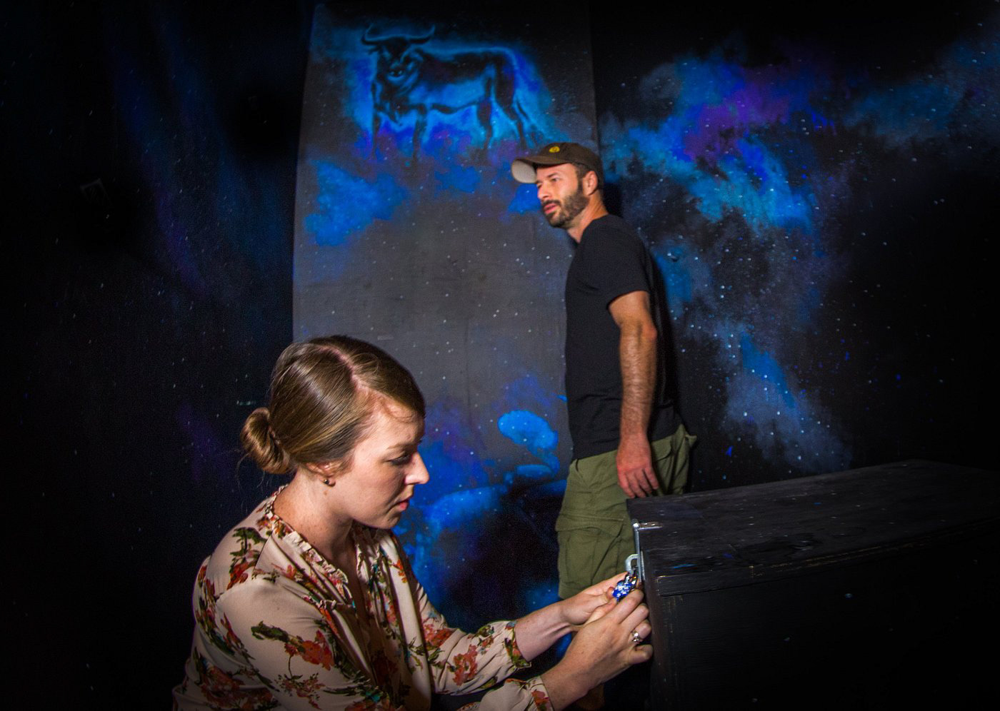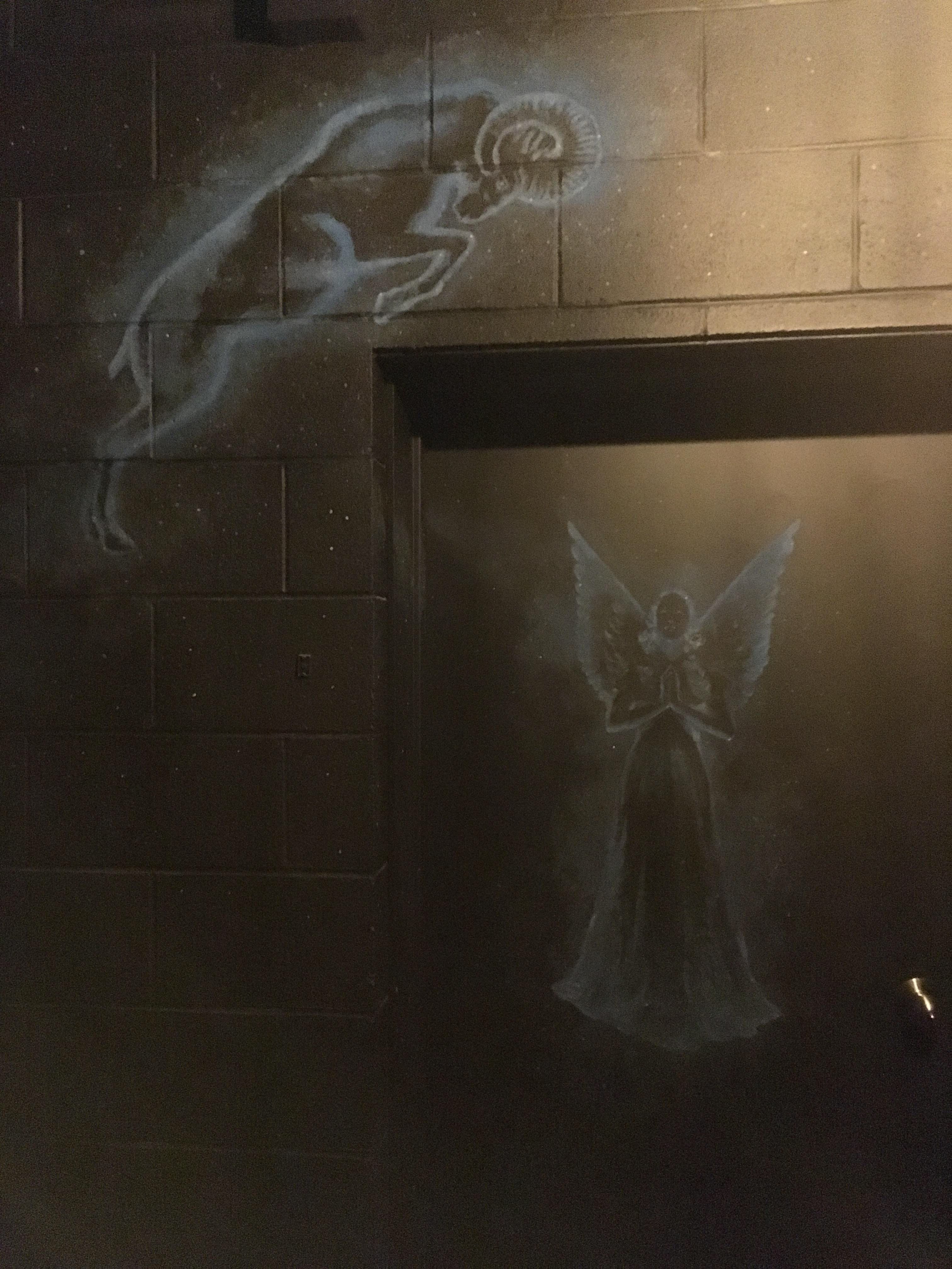 Wall mural with hidden image revealed under black light.