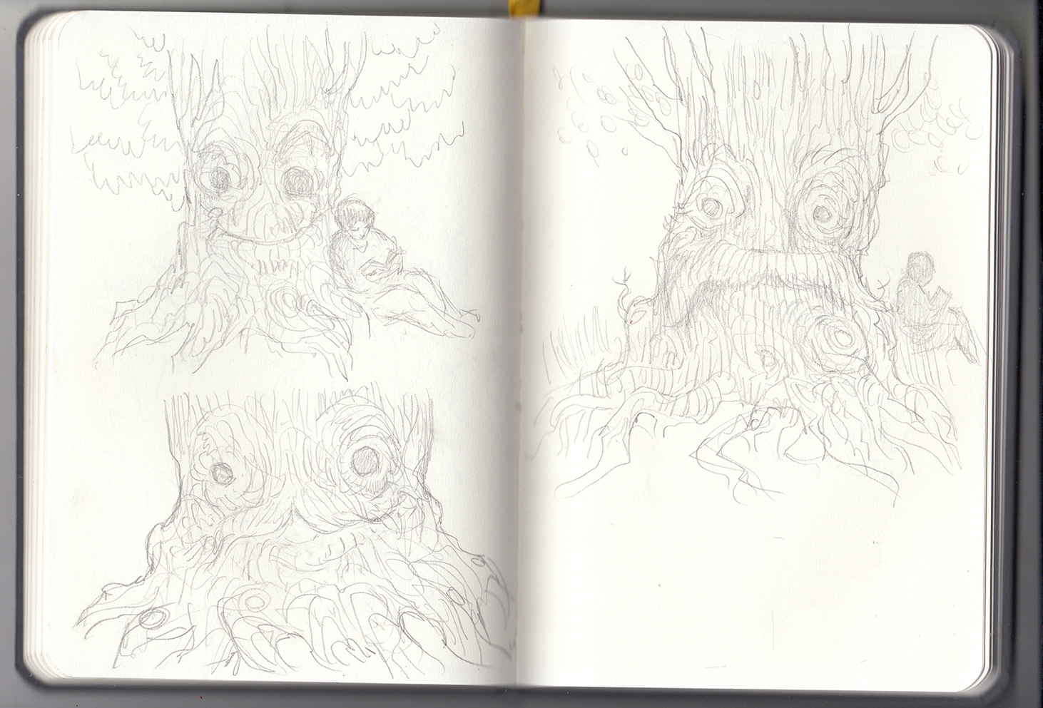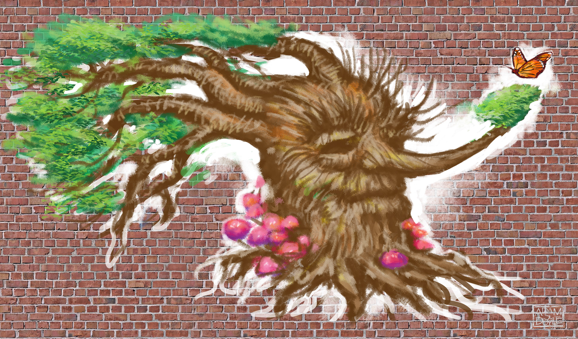 Originally I conceived of this image as one in a series. Below are my sketches and mockups for an enchanted forest that would appear all over town.