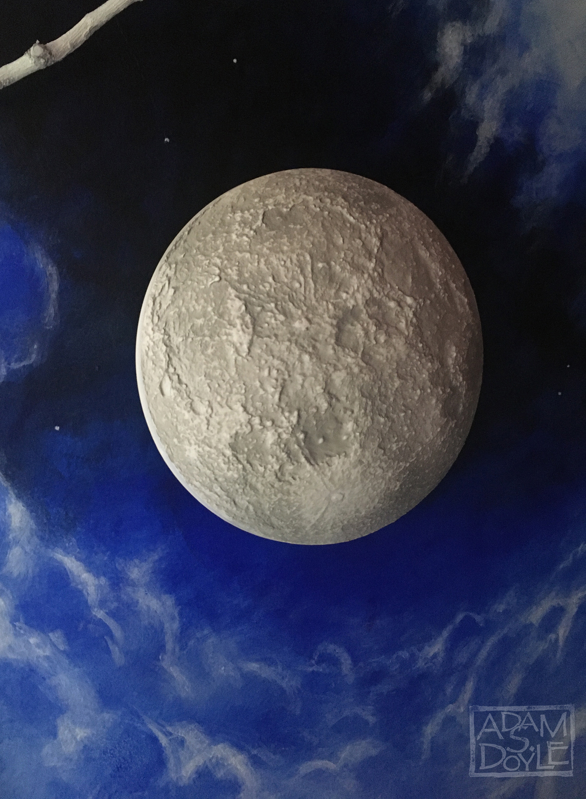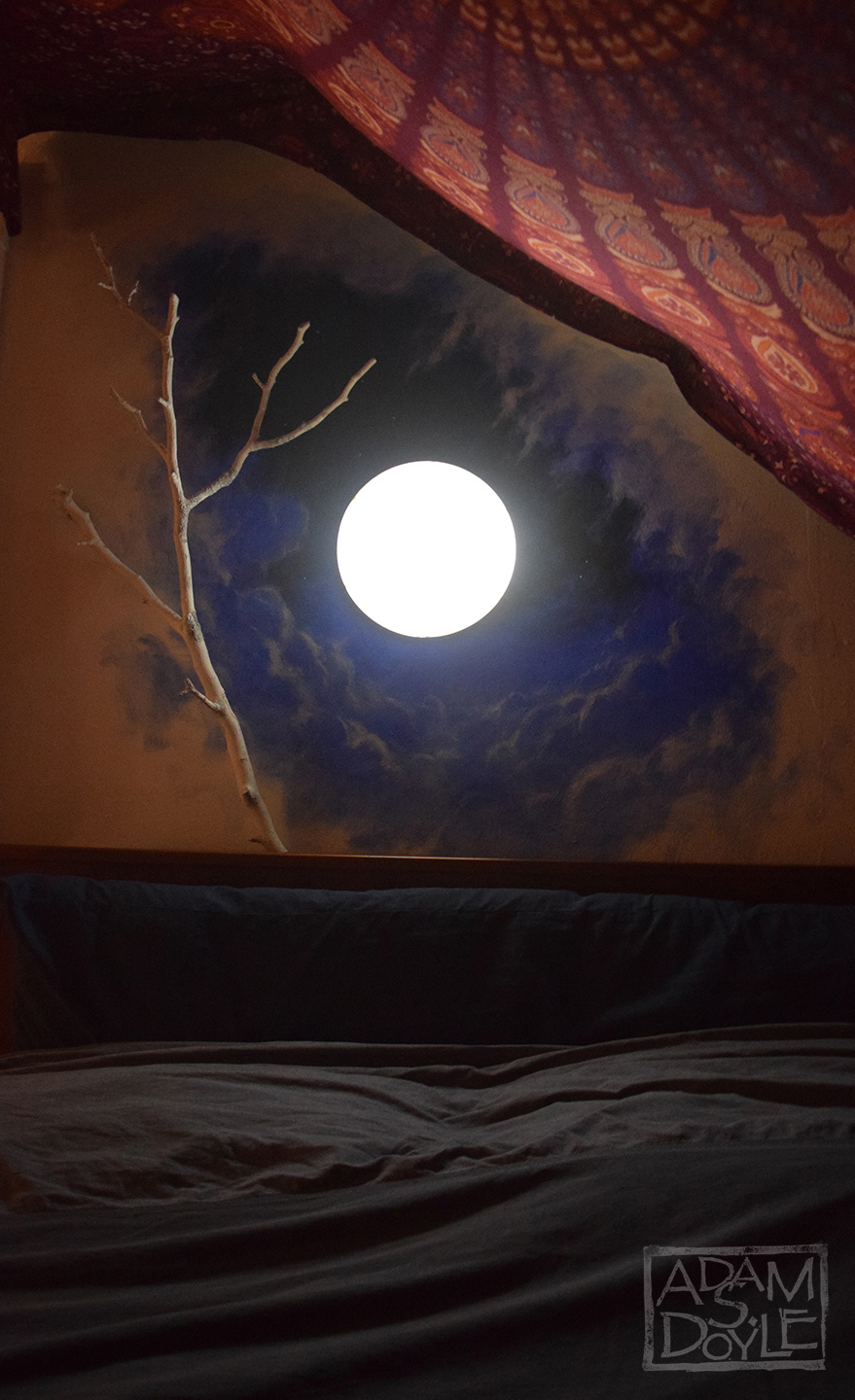 Custom bedroom mural under a hanging tapestry. Includes a moon light above the bed for nighttime reading, accented by a real branch.