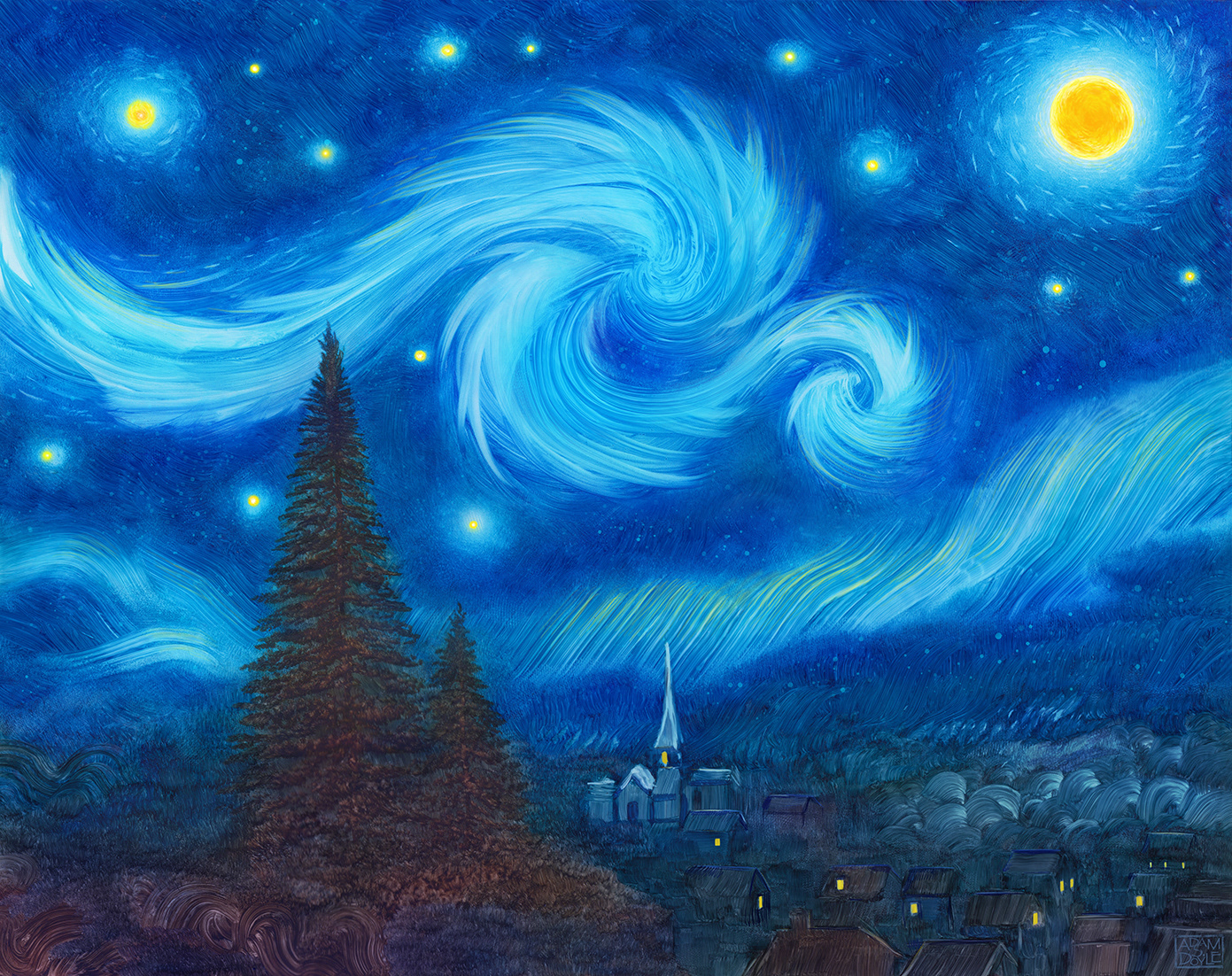 It's rare that I reinterpret another artist's work, but I've had my eye on Starry Night for a while. One of Van Gogh's most well known paintings, Starry Night was made in the last year of his life, while he residing at an asylum. The landscape wasn't a depiction of the area; it came entirely from his imagination.