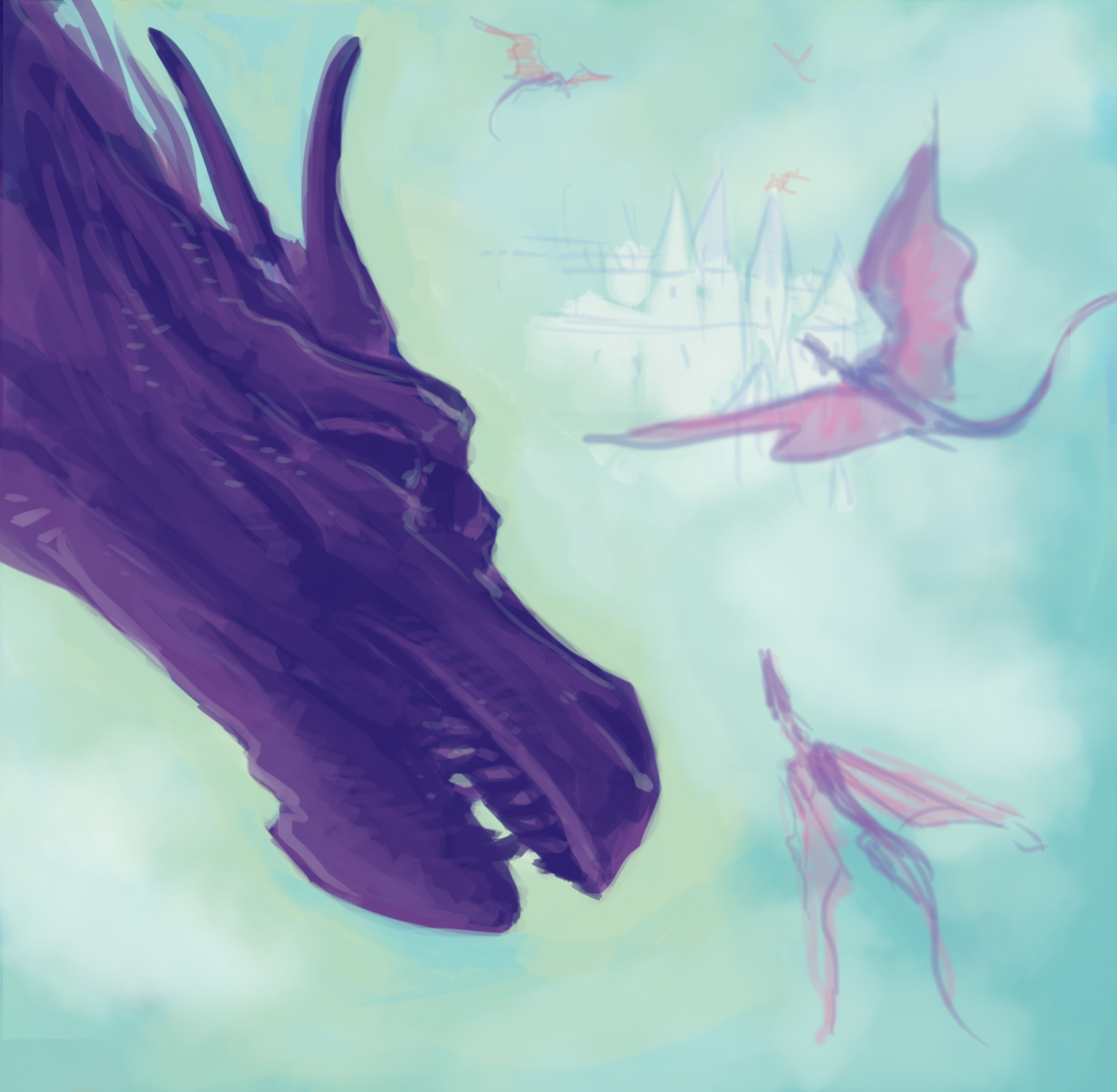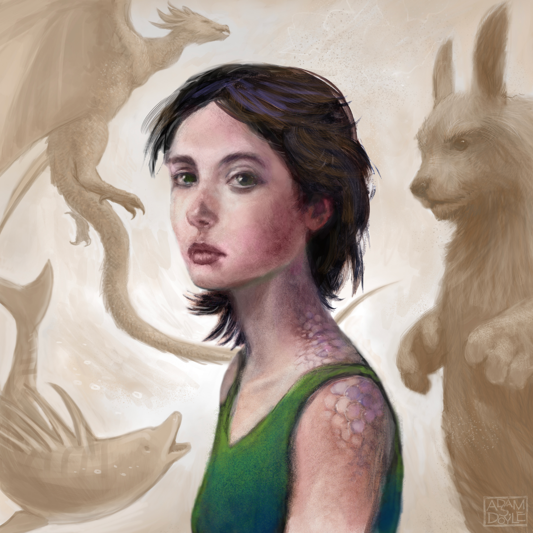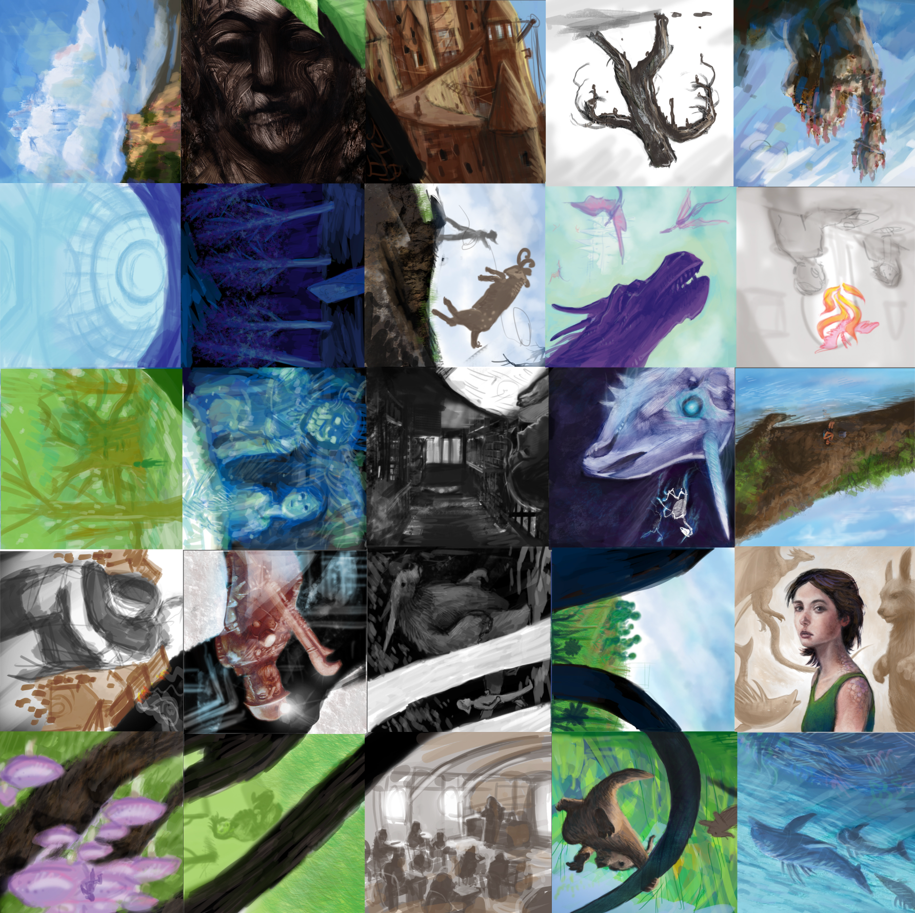 Sketches for an original fantasy story about a girl wrestling with the animal form she's destined to take. The book works in such a way that the answer to the question is revealed to the reader at the end by assembling all of the illustrations.